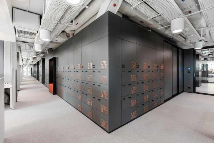 Referring to brewery kettles, solid partitions positioned perpendicularly to the façade are finished in copper panels to introduce warm-coloured tones and reinterpret industrial themes. These boxes have different functions built into them depending on location, like AV equipment, whiteboards or personal lockers. Copper panels are impregnated to prevent from staining and darkening.