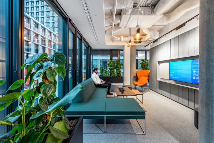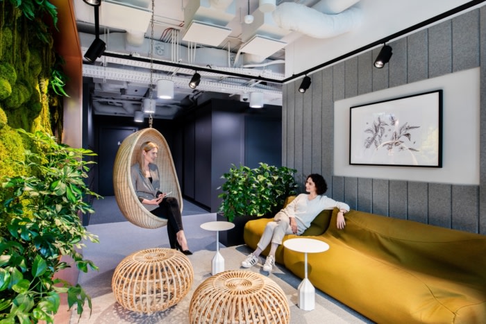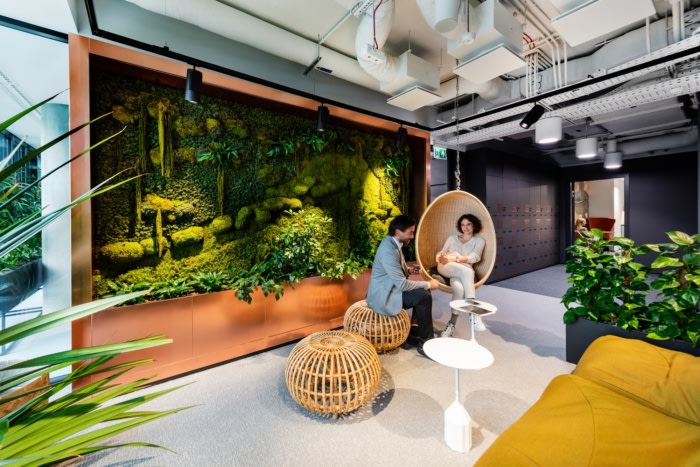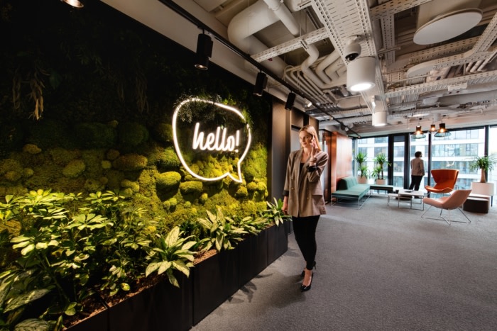 The main entrance leads to a common welcome area which also provides access to main meeting rooms. The arrangement of space benefits from great views outside to create a bright and welcoming experience. A large moss wall, combined with natural planting and neon light acts as the first eye-catching element.