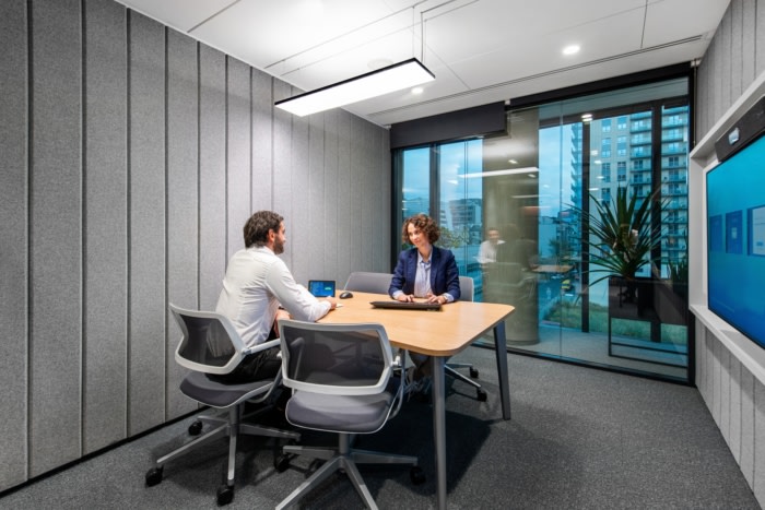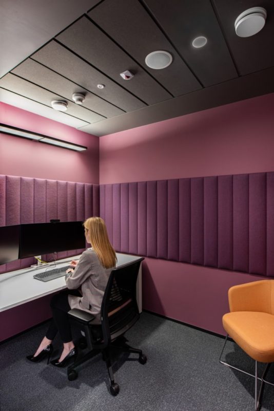 Open-space areas feature a calming, toned-down material palette with warm yellow colour accents. The partitions perpendicular to the façade are clad in light-grey felt panels to improve acoustic quality – both within these rooms and in the open-space around them. Two other walls are fully glazed to maintain views outside and benefit from natural light.
