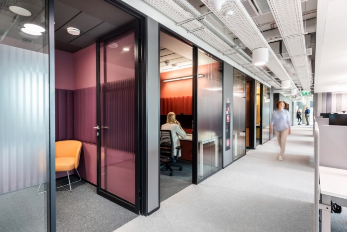 Enclosed focus rooms are located in groups of four rooms on each side of the floorplan. Depending on size they feature one or two seats and a desk to allow both individual work and 1-on-1 meetings.