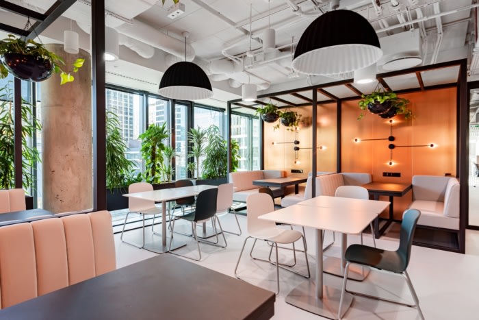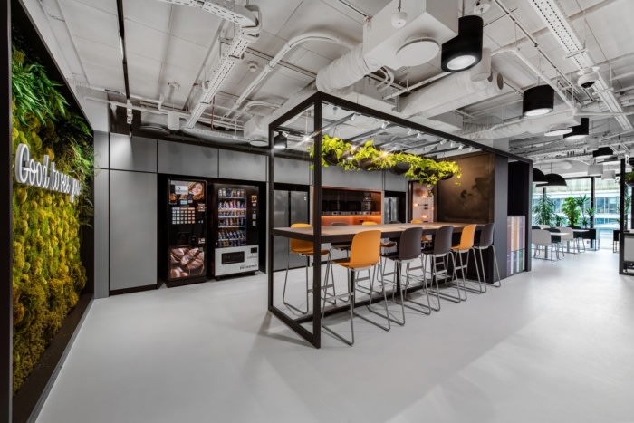 Pantry rooms act also as a welcome area and similarly to the other main entrance, feature a large green wall. A common table where people can gather for a quick coffee break eases social interactions. The dining area is lit with natural light and provides direct views to the outside. Suited for lunch breaks, it features smaller tables and diner-style seating.