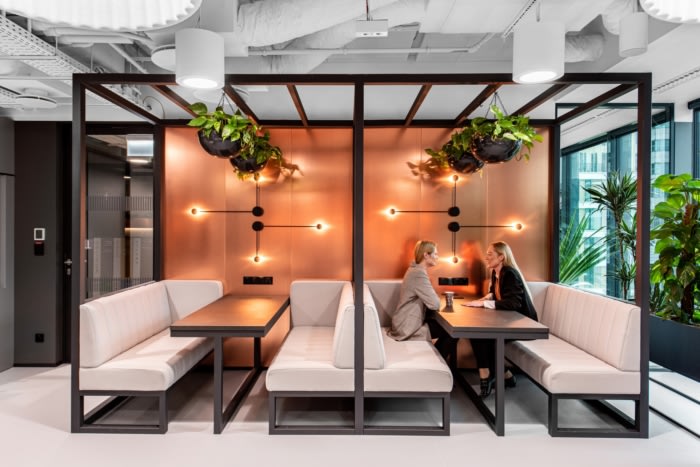 Colours used in the project are based on industrial metals (bronze, copper, gold) coupled with dark monochromatic structures and semi-translucent glazing. The palette creates a cosy, yet sophisticated ambience and a background to introduce biophillic design elements.