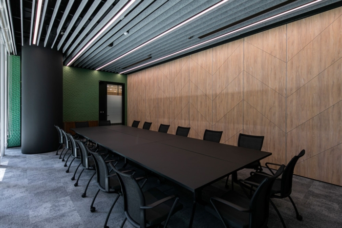 Immense importance is given to natural lighting and is achieved through large windows that allow plenty of sunlight to pour in. An interesting point to the design of this office is, no matter where one is seated, one will be afforded with a view of nature, via the huge windows that overlook the greenery outside or the dry green wall, which have become a rising new trend of built environments in recent years. At strategic points, lush foliage provide respite to tired eyes and help recharge energy and productivity levels. In the conference room, the embossed sound-absorbing panel provides a striking contrast to the rest of the space.