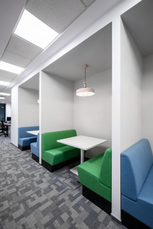Acoustic meeting-boxes and phone booths have been placed in the open space in order to cover the need for private conversations such as interviews, teleconferences and other short staff meetings.