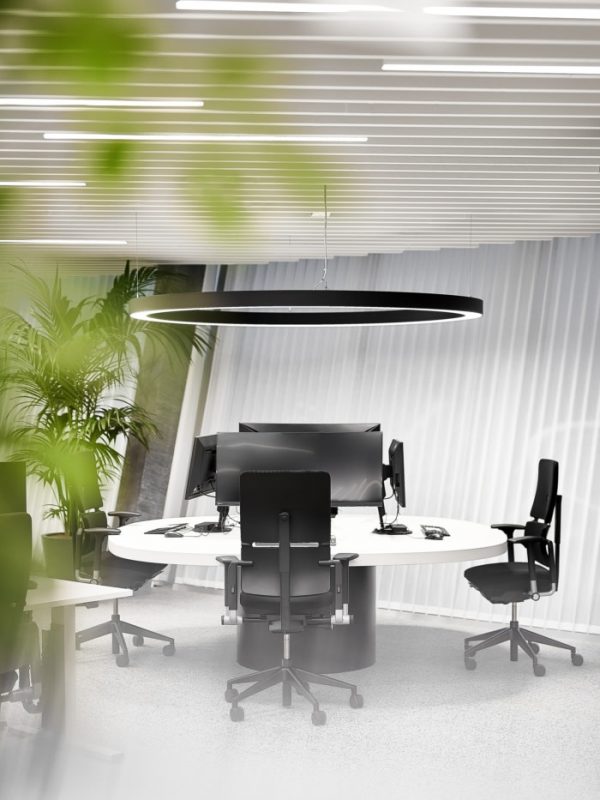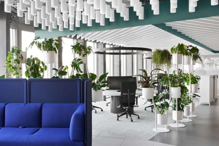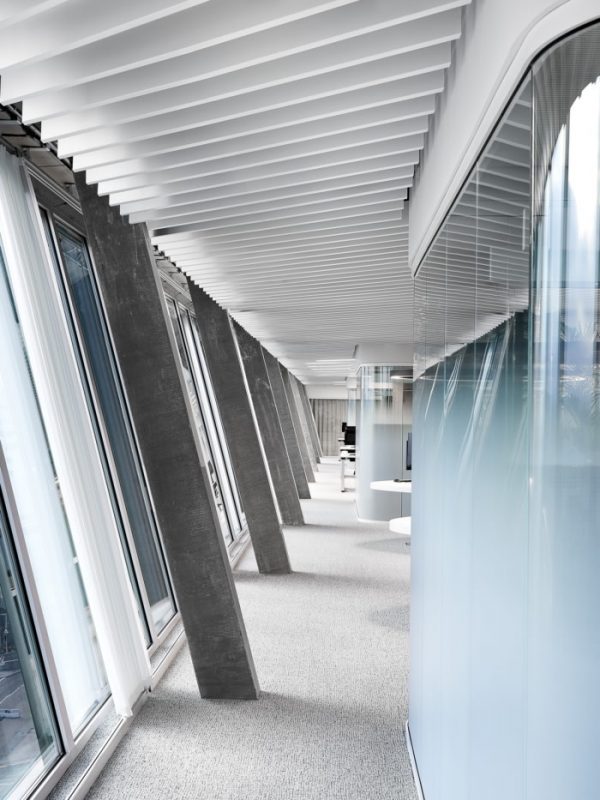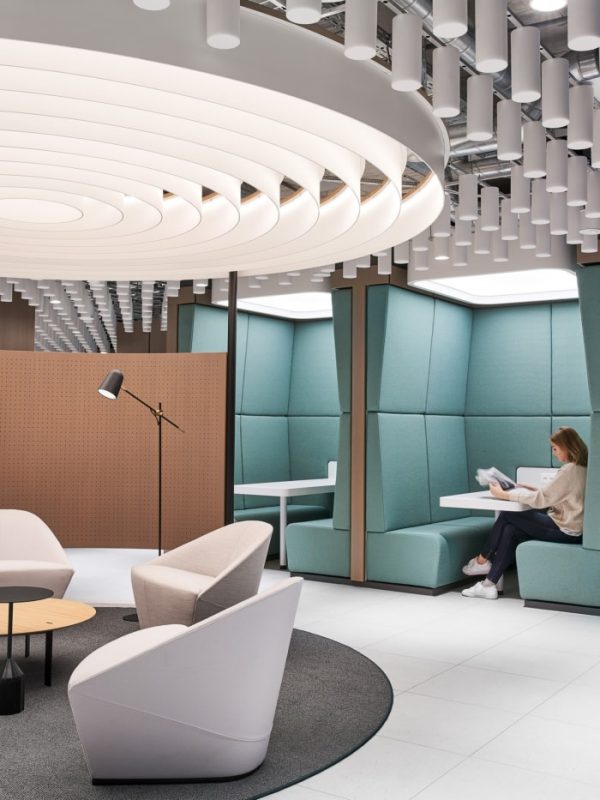 Good spatial acoustics are not only crucial in the focus zone, but throughout the entire open space. By using carpeting and acoustic elements such as cylindrical absorbers as a functional as well as an aesthetic element in the ceiling design, we minimise footfall and speech sound, and at the same time create a recognition value that permeates the entire office