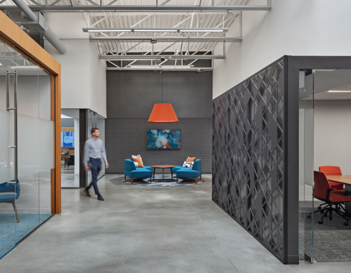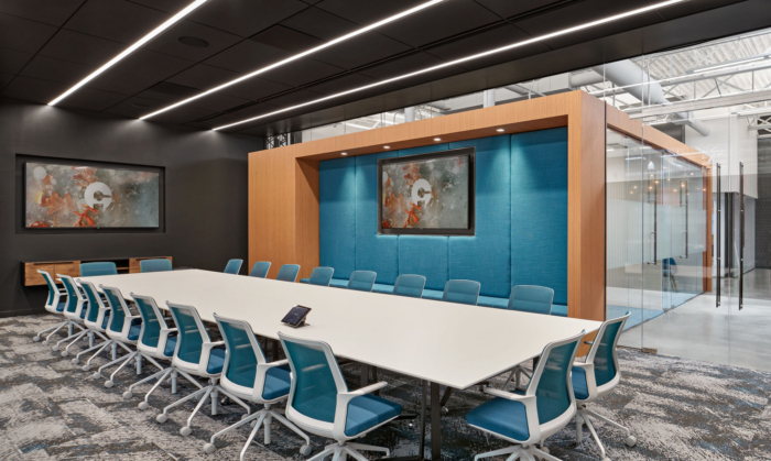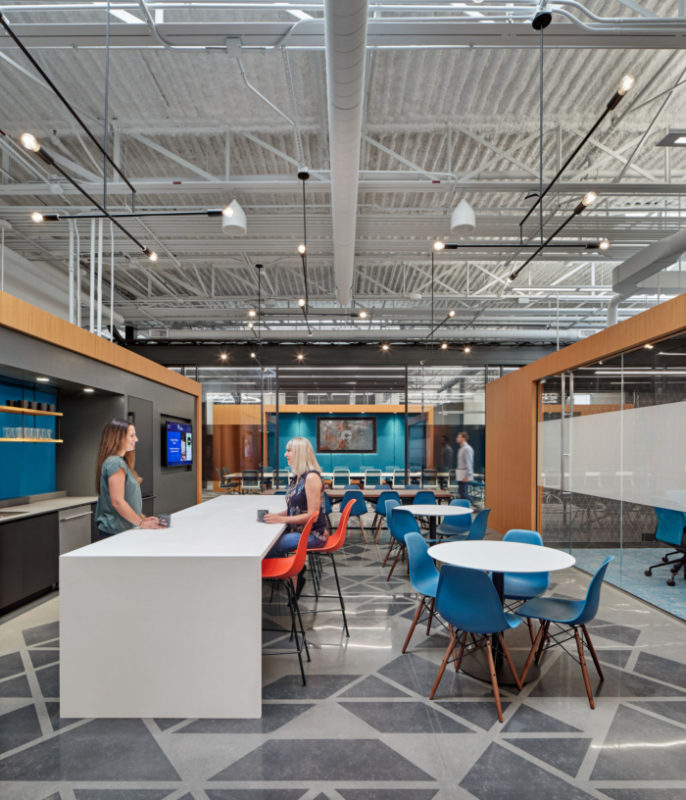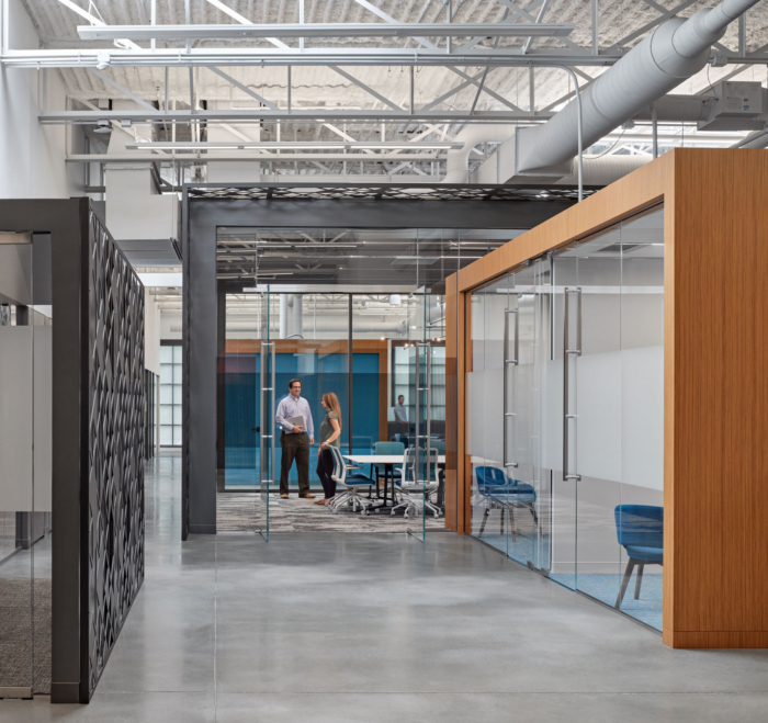 Designers maximized existing features, which included high ceilings, skylights, and a long southern-facing glazed wall, bathing the interior in light. Use of glass throughout the headquarters and along a central corridor, or “main street,” defines program spaces and allows glimpses of activity. A particular highlight is a large conference room adjacent to the café-lounge. The boardroom’s large sliding glass wall opens to unite the spaces to allow for larger meetings or events.