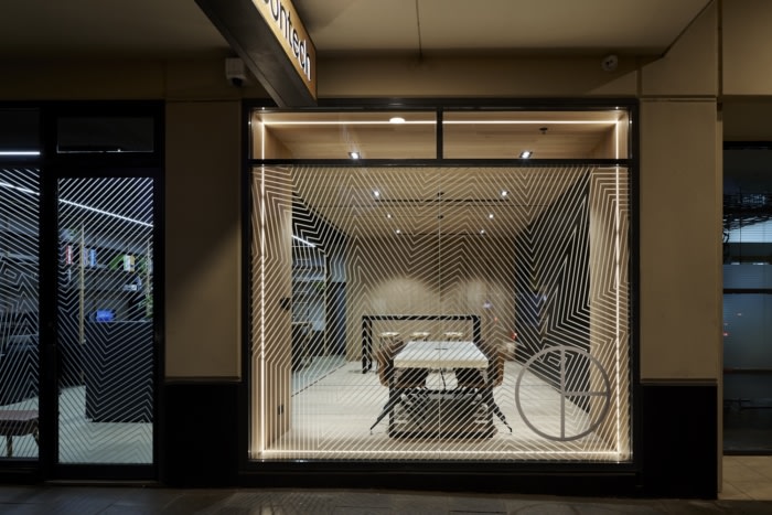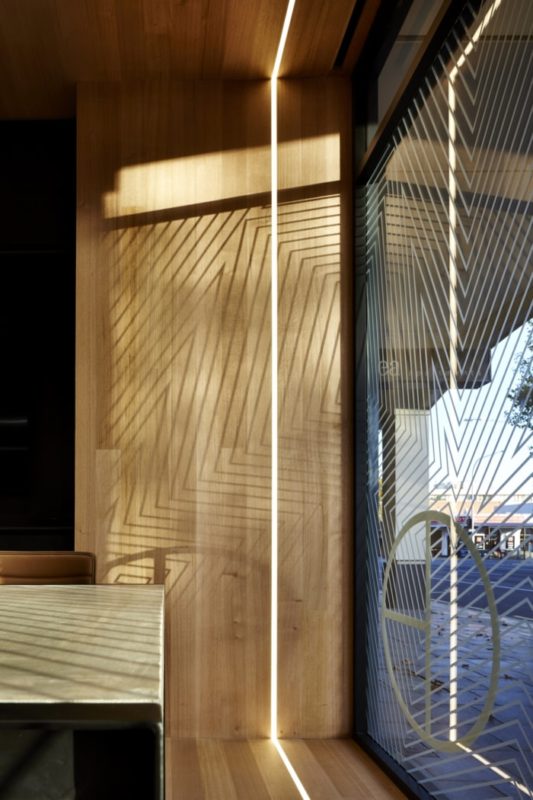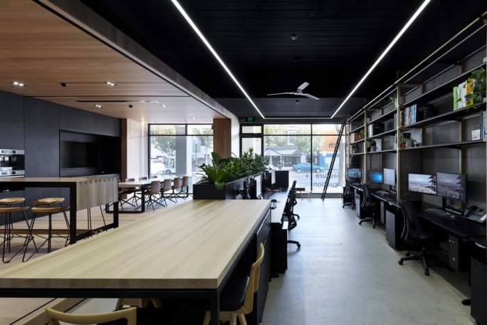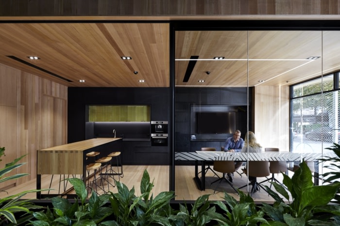 Select grade Tassie oak panelling seamlessly folds from floor to wall to ceiling, defining the minimal form that penetrates the space. The vessel sits beneath a black exposed tenancy ceiling that falls away into the abyss, heightening the volumetric experience. Housed within the tube is a minimalist kitchen and boardroom joinery piece, formed from rich carbonised timber; its utility defines the otherwise open plan space. An expansive steel framed glass sliding door and bi-fold system, detailed with black perforated panelling, further defines the meeting room for more formal occasions, providing privacy while still allowing daylight to filter through. These dividing elements cleverly disappear when no longer required, concealed within the body of the vessel.