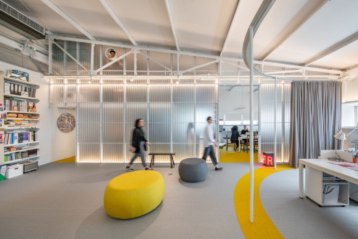 A functional area offers separated meeting rooms, kitchen, storage and rest areas that are included into a former repurposed mezzanine level to maximize organization. These rooms are physically separated with a semi-transparent double layered wall made out of polycarbonate corrugated panels. The only continuous solid wall without windows accommodates a vast shelf that includes the material and reference library, together with a selection of models and Crossboundaries Award display.