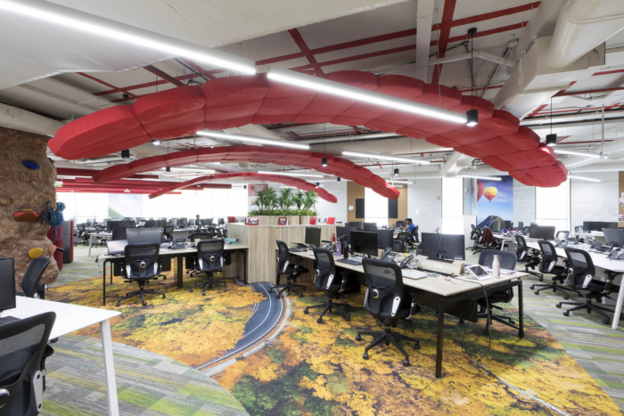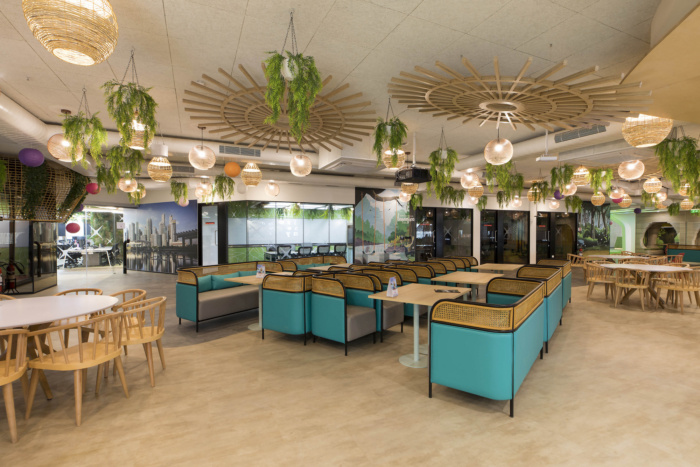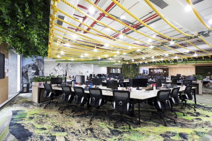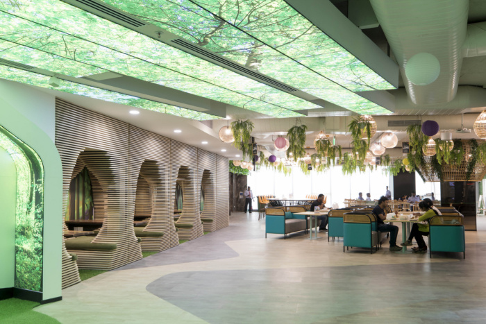 Inspired by the great outdoor adventures one can experience in India, a journey through the office will take one high up in the mountain at Kolli Hills, deep into the blue ocean of Goa, on the wall of Shey Rock region in Leh, to paragliding at Himachal. A highlight of the new office includes the Forest Walk, a feature walkway by the reception. Creating a calm and warm welcoming atmosphere for all, this walkway greets employees and guests with ambient nature sounds and forest visualisation. The unique entrance directs people through a light tunnel wrapped with a lit tree canopy to the main social hub. The Forest Walk plays on one’s sense of sight and sound to create an immersive experience.