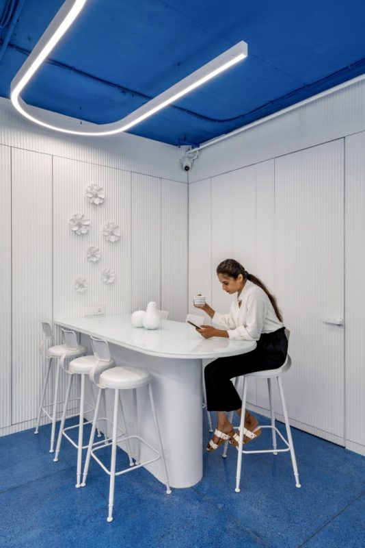 We conceived a contemporary decor scheme rooted in warmth and vibrancy, with white walls put-together with blue floor and ceiling. Entire office floor features cast in-situ blue terrazzo flooring. The blue ceiling and floor anchors the surrounding white walls and furniture, pulling them into a cohesive composition. White walls and furniture gives the space a tranquil feel and creates an infinity effect. Bespoke Profile lights planned in the workspace leads an entrant into 3 different paths; the master cabin, workstation, and the pantry. Curved fluted wall panels on the workstation and pantry walls, gives the space a clean, fresh look complementing the theme. The walk-in-passage to the master cabin showcases live 3D models of on-going projects along with their floor plans that add an element of intrigue for visitors, giving them a vision on the type of work we deliver.