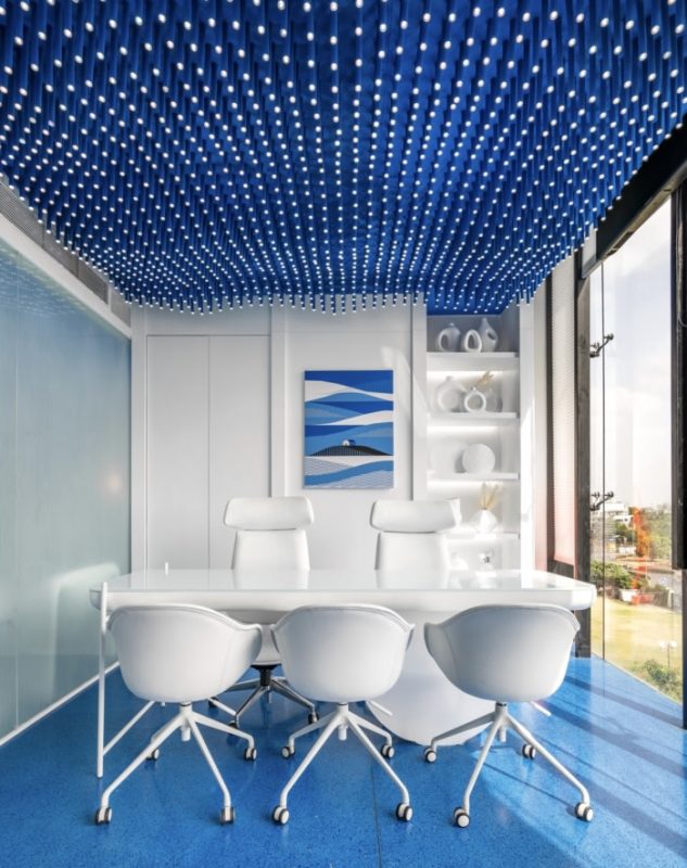 As one enters the master cabin, they witness a spectacular view to the busy city from the infinite glass walls. The S-curved custom-made false ceiling gives the cabin a picturesque frame. Visitors are greeted by a wall fitted with an interesting installation of custom art piece in white, modeled in clay by a local artist. The wall opposite to the director chair showcases a live material board of the office design plan including all finishing materials used in the office interiors.