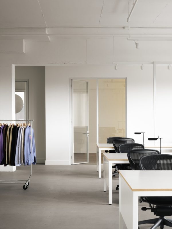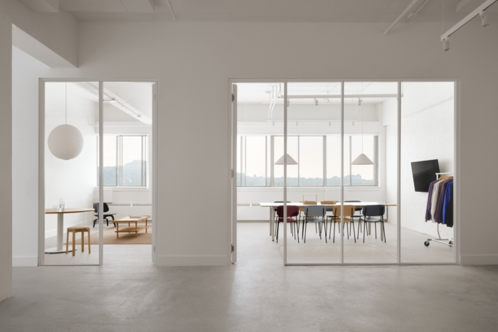 An open workspace unfolds along the large, mountain-facing bay windows of the building. This area leads to three closed rooms: two offices and one meeting room. Concealed by the utility core, the creation area is a large workshop-like space, which contains a large table for measuring patterns, a material library, and clothing racks.