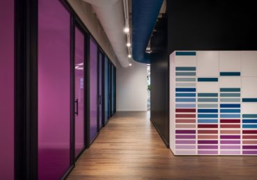 The kitchen design is thus focused on a large, steel, island-type table, creating space for informal meetings and socialization. Connected to the entrance and kitchen are two meeting rooms of different sizes. The largest one, which can comfortably welcome 10-12 people, is intended to facilitate the design and development teams’ daily reviews. The second room offers a more flexible and modular layout to accommodate a variety of team needs.