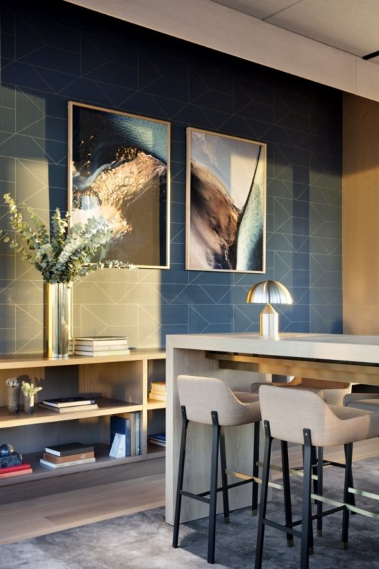 Fogarty Finger created a welcoming atmosphere on the sixteenth-floor by pulling inspiration from the concept of a vintage yacht, incorporating richer and darker color palettes of warm woods, and a ceiling of brass mesh. Using both bespoke and vintage furniture, the interiors reflect the emerging creatives using this work space. The three conference rooms seat up to 200 people and can be joined to form a large town hall area, perfect for a collaborative work environment. When taking a break, tenants can enjoy the lounge area with window-side seating and a bar overlooking the city.