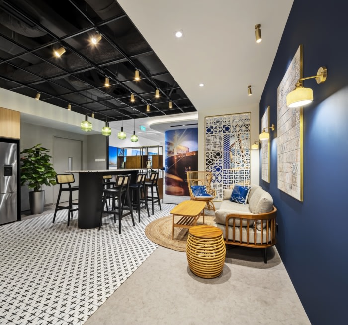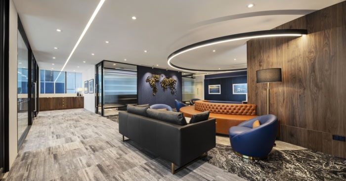 Upon arrival at the floor, the guests are greeted by a majestic and welcoming corporate wall intertwined with the front desk, which is highly inspired by the organization’s logo.The floor tiles magnify and mirrored the representation of curves and fluidity of the ceiling and vertical elevations. The rich texture and tone from the American walnut panels blends elegantly with the black articulation of the meeting rooms. Exquisite detailing in brass is used to highlight and elevate the appeals.