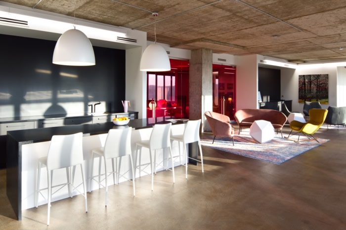 Balancing the rawness of the exposed concrete are whispers of light wood and soft, supple handed textiles in hues of pink and yellow. Multi-coloured throw rugs in blues, pinks and yellows soften the concrete floor while a rocking chair beckons you to sit awhile. Swaths of pink interior glazing seen immediately upon entering the studio lend a rosy hue to dramatic sunsets via the Event Space, an open multi-purpose area that functions as a waiting room for clients, vendors and guests; a café; a lunch room; and event space for world events/sports/ news/movies and continuing education lunch n learns, informal meeting space and work space.