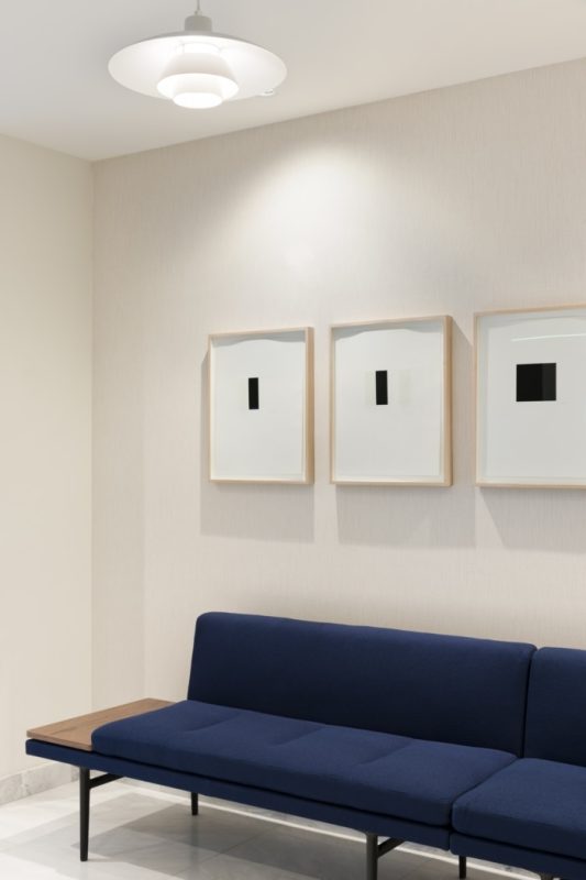 The space features 18 private offices along the perimeter, two interior offices, a work area with an adjoining pantry, three conference rooms, and, most importantly, a board room. Spectorgroup created an open-ceiling corridor for added height, glass office doors with privacy film to maximize light, and a natural color palette with subtle textures to soften the space, including stone, porcelain and decorative tile, fabric-wrapped wall covering, accent paint, and elegant, sleek lighting.