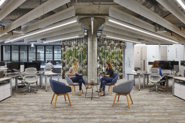 The building’s pursuit of Net-Zero Energy Certification complements DPR’s WELL and LEED Certification targets. Sustainable/environmentally friendly practices and features include the use of local materials, views to the outside, added skylights for increased natural light, and multiple green walls that also provide privacy. Essentially a “living lab” that shows how companies can build in ways that respect the environment, employees, and the community, the new office emphasizes sustainability, employee enjoyment, and a work/play balance (there is a game area), as well as the Austin spirit.