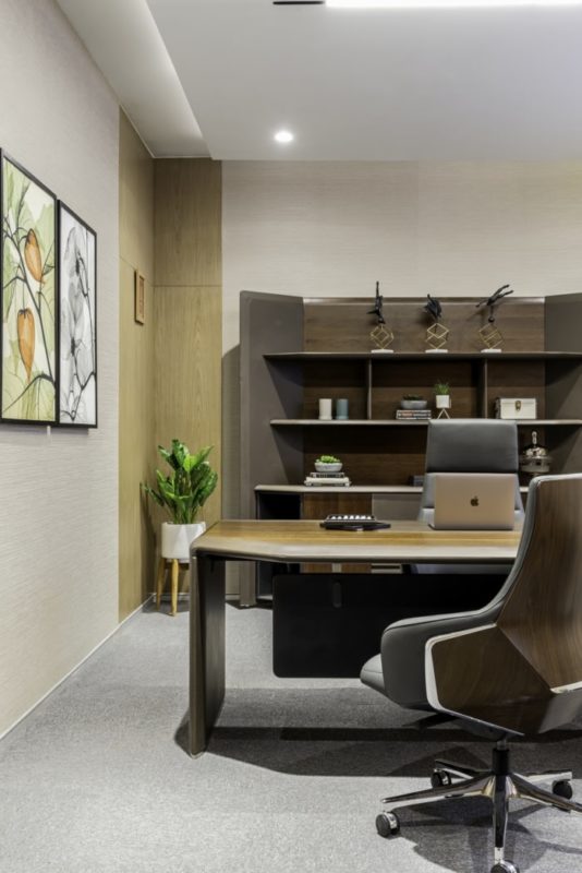 Everything in the office is very subtle & serene. We have a massive pop of colour in the central admin area. The blue colour in the central area has been taken from the company’s logo. The breakout area has a vibrant wall with a play on words & graphics. Art & graphics al through the space has been designed keeping in mind the real estate business of the firm.