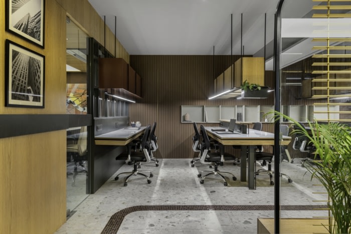 The partition between the cabins and the employee area is a pseudo-three-centered metallic arch with a glass panel hanging from above. It has a wooden storage cabinet on one side and a planter on the other. The planter is topped with a photosynthesis light for better growth of plants. A brass-coated metal element intensifies the aesthetics and brings a classy look. Loose furniture is placed in the middle encouraging a motivating workspace culture.