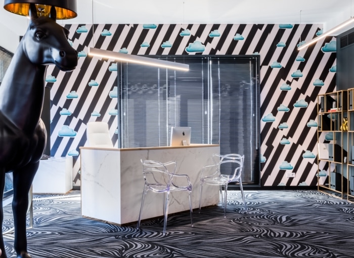 Once in the director’s office, all the stereotypes collapse. There is no usual rigor here. As soon as you cross the threshold, you begin to get to know its owners. The interior makes a big statement. Run up and jump onto the pink sofa. You find yourself between two marble tables, black and white, Yin and Yang, your project will be approved or sent to hell. Ok, relax, because you are hypnotized by the pattern on the floor, and a bottle of cool water is waiting for you in the mirrored bar.
