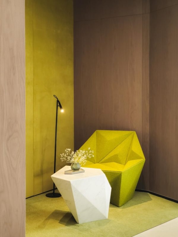 Well-educated Chinese professionals are striving for economic advancement, but also for individuality and a self-determined lifestyle. We meet this desire with an interior architecture that allows uniqueness to permeate all levels. Polygonal shapes run throughout the space: from the reception desk to a flower vase, from the ceiling to a humble water glass. The multifaceted space surprises at every turn with refractions and fascinating details. It expresses the energy and dynamism that we bring to meet today’s increasingly complex world. At the same time, this multifaceted structure is our translation of individuality in the spatial realm: A chaos of vibrant interconnectivity spans the sales centre; individual elements are broken in their symmetry and appear to have grown together again almost organically.Technology meets emotion