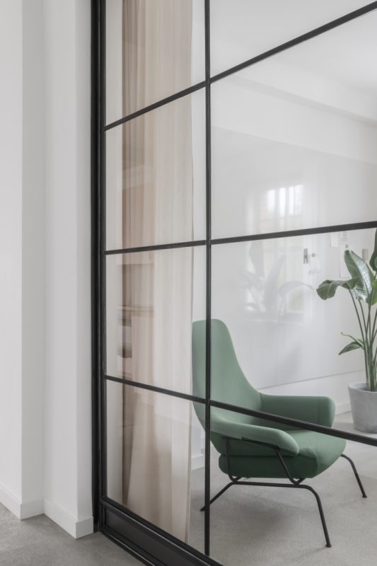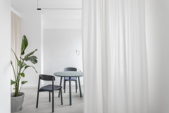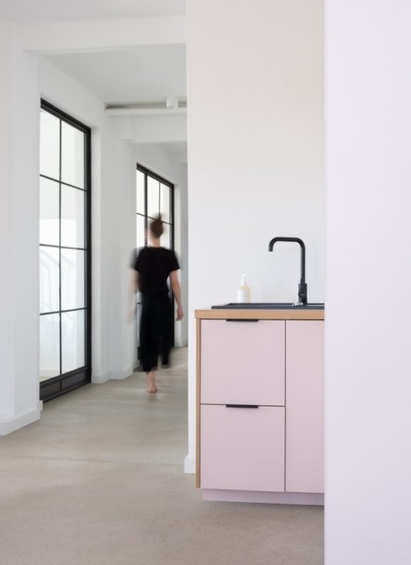 When entering the space, the view falls through the long hallway into the pink-colored open kitchen, which is the heart of the office community. The long table has accompanied Farbenmeer since the company was founded – this is where people spontaneously meet at the coffee machine, exchange news, or discuss topics in larger team meetings. The concept on the lower floor is a combination of flexible agile areas and workstations for focused work.Steel framed glass walls separate the offices from the hallway. When needed, the self-organized project teams can flexibly divide the space. For more privacy, a second layer of light curtains can be pulled in front of the transparent walls. A clean color palette and minimalist furnishing provide clarity amidst the vibrant neighborhood.