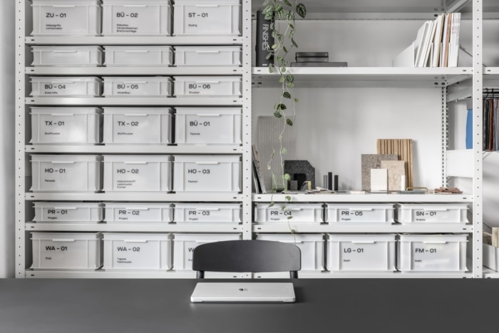 The floor-to-ceiling storage shelf holds the ever-growing material library. A variety of surfaces and materials used in architecture and interior design are stored here and are organized by product group in labeled archive boxes.