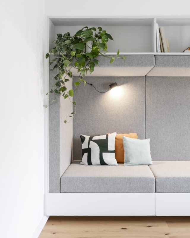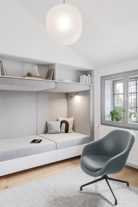 The quiet room provides a perfect retreat for personal exchanges in small groups, video calls or focus work. If required, the built-in seating niche can be used as a cozy bed for naps. Soft colors and tactile textures bring tranquility and support slowing down.