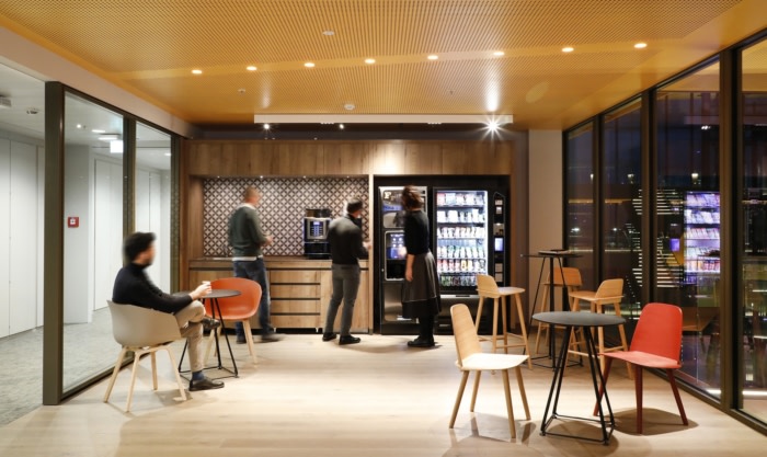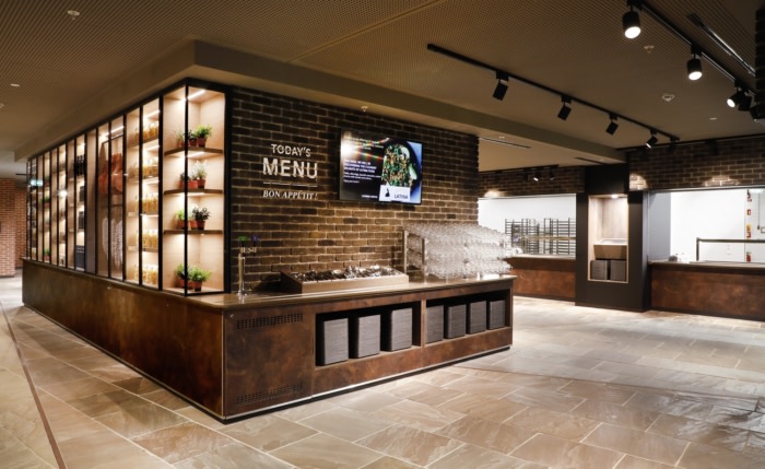 Four restaurants and a café occupy a total of 1,200 square meters and enable an everyday change of scenery and comfort for employees. Their design conveys quality, healthy eating, variety and taste – an overall feeling of wellbeing.