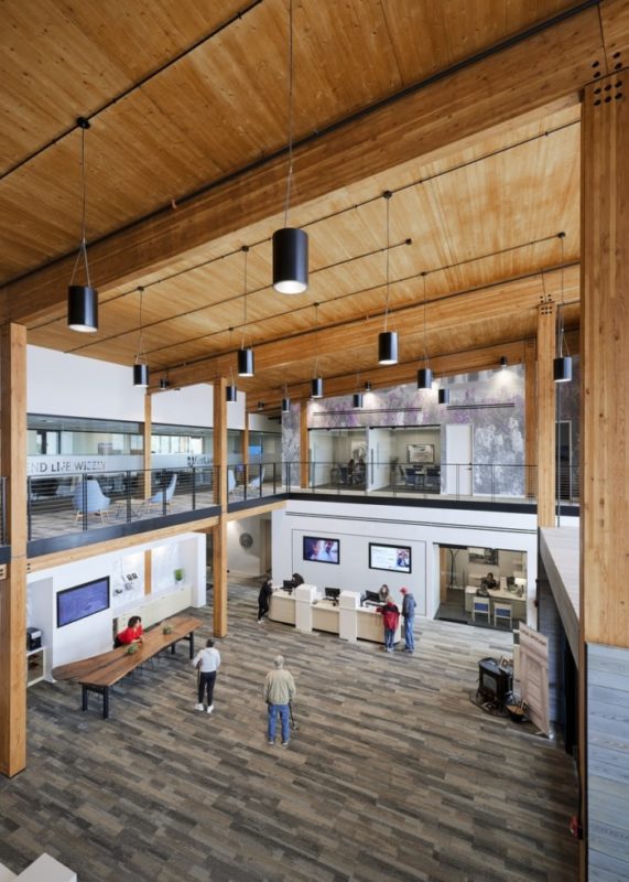 Douglas fir, an evergreen conifer species found in the Pinaceae pine family, makes up the cross-laminated timber (CLT) panels and remains exposed along with glulam beams. These mass timber elements display the use of renewable and sustainable resources as an alternative to more fossil fuel-intensive materials. The result is no carbon emissions from the building’s structure, with an estimate of 190 tons of CO2 being offset by using the sustainably harvested timber. This project is the first location in Texas to use CLT panels for shear walls. Orienting the CLT panels vertically provides a more efficient structural system while simultaneously becoming an architectural showpiece in multiple locations throughout the building.