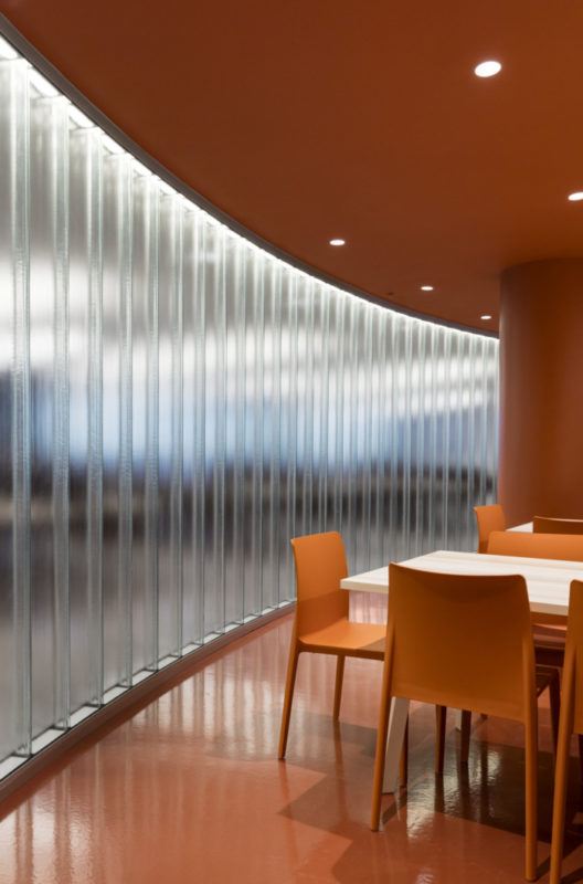 In creating zones that are insulated from one another, ACDF was faced with the challenge of extending the concept of ‘flow’ to the supply of natural light. In response, the innovative design incorporated channel glass to serve as a barrier between the common and private zones, with an alluring solar finish that enables natural light to filter from the exterior to the interior core. The doubled channel glass also creates an acoustic and visual buffer between the lively, colourful ambiance of the open spaces and the tribal work zones.