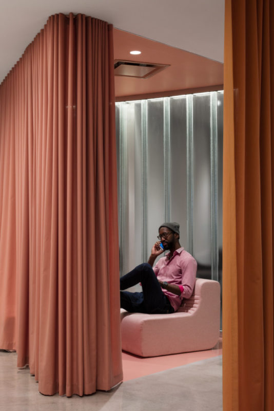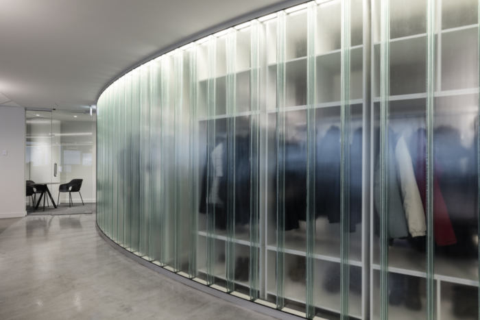 At the heart of the project, an inner common space concentrated around the elevator core includes a reception area, a main kitchen, a small conference room, and a lounge area. Functional millwork emerges from the central core, providing a visual aesthetic of floating particles throughout. Curtains provide flexibility to the common area, offering the opportunity to subdivide the open space into private zones that can be used for meetings or smaller events.