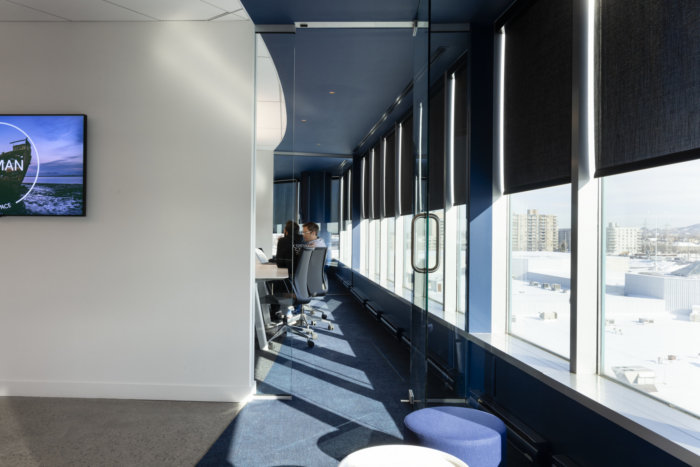 Concentrated along the outer perimeter of the common areas, the services core is wrapped in light-weight aluminum foam that serves as both an acoustic buffer and a nod to the aerospace industry. Using subtle transitions in materials and tones, the design delineates different zones through colour and serves as a wayfinding reference system that corresponds to specific programs within the company’s operations. Each tribal zone is independent from the others, each equipped with its own storage space, print room, kitchenette, phone booth, and conference room.