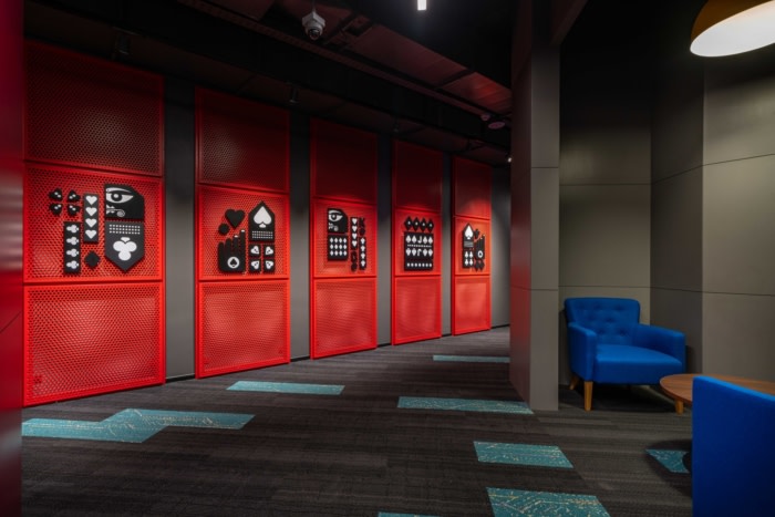 A walk through this office leaves no doubt to the imagination about the kind of work that Flutter does. With no defined corporate branding guidelines for the workplace, Symmetrics thoughtfully curated the environmental graphics design for the entire space to incorporate elements of gaming and sports with vinyl prints, art, graffiti, and 3D graphics. The artwork was inspired by pop culture adding a young and vibrant feel to the space. The colour scheme of the entire office was designed to complement this thought process.