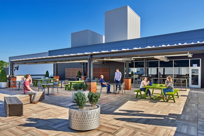 Shared spaces in the new facility include a feature entry lobby for visitors and clients featuring a two-story image of the new rolling road wind tunnel fan blades on the back wall. The lobby lighting and reclaimed wood slats on the wall simulate motion (air waves) from the fan blade picture. The wood slats were even curved at the bottom of the wall to simulate air movement over a feature vehicle placed in the lobby. Additional shared spaces include cafés on the first and second floors, with the second floor café opening up to a rooftop patio. The rooftop patio allows for a unique break area that is partially covered with a translucent canopy to protect users from the sun or inclement weather.