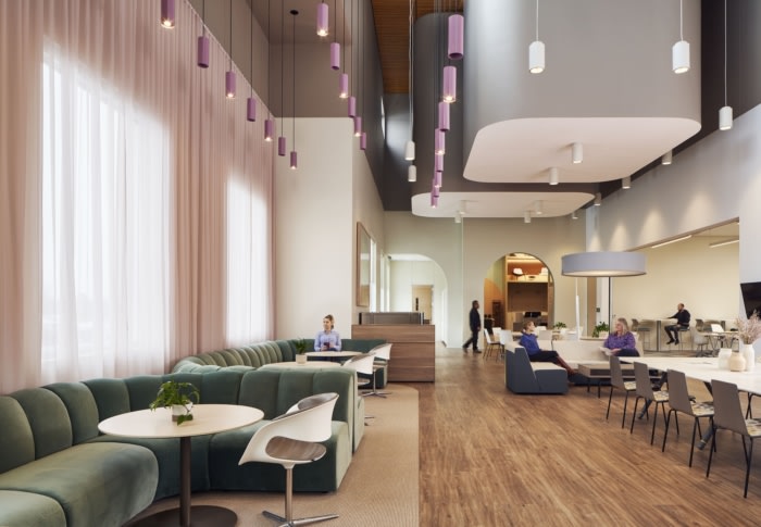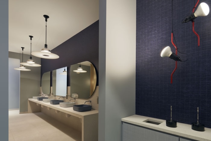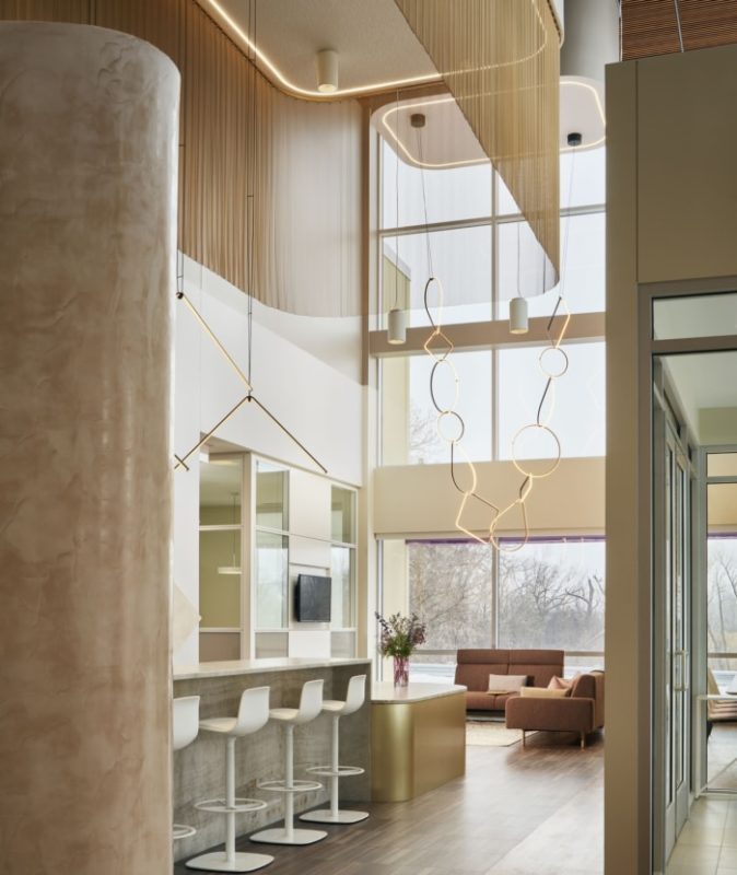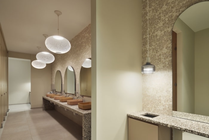 We did not shy away from the feminine aspect of the business- using a soft palette and curved architecture. Upon entering the showroom, visitors are greeted with a soft gray marble and brushed brass bar that is layered with a pink plaster backdrop. Overhead, a warm wood ceiling gives the warehouse space a high-end look while keeping the high ceilings. In the employee WorkCafe, mint colored velvet sofas are set against a pink Kvadrat, double height drapery. The lighting was used as “jewelry” in the space, an accent that adds interest in a dramatic way. One installation was inspired by a necklace which drapes over a lounge area within the showroom lobby.