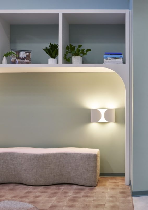 The space acts as both a showroom, office, mockup area and warehouse creating the ultimate service center for their employees and clients. Connecting each space is a soft palette and curved architecture that layer upon each other as you move throughout the showroom. The most dynamic space is named the Sandbox which is meant to be a place where clients can pick from many different types of furniture to create their own customized mockup. A large furniture display was designed to feature items to be used. Within the display, each cubby is accented in different ways using paint colors, mirror and wood and each of them highlighted with accent lighting.