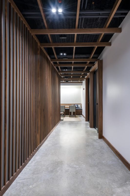 High quality finishes and design were implemented to underscore the high levels of investment the firm deals with and connect with clients. However, it was also imperative that we convey a sense of comfort and approachability indicative of Foxhaven’s culture. To help balance the refined look of walnut panels, we used local craftsmen to create concrete counter tops and select pieces of reclaimed wood furniture. Exposed ceilings and concrete floors aided in keeping the space feeling open and bright, while letting the walnut be the feature.
