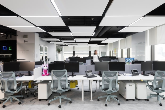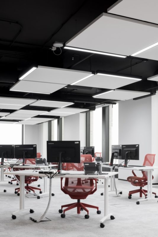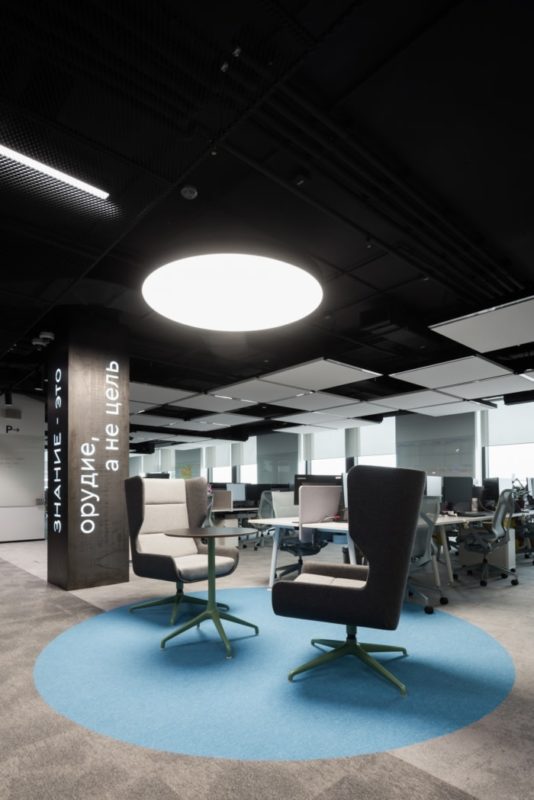 Some workplaces have а “free” placement. In addition, open space is filled with portable adjustable furniture. Beyond that, there is a printer zone, phone cabins, portable noise cancellation borders, small soft spaces and hot-desks, marker-boards and flip-boards. All of this make office close in spirit to the agile philosophy.