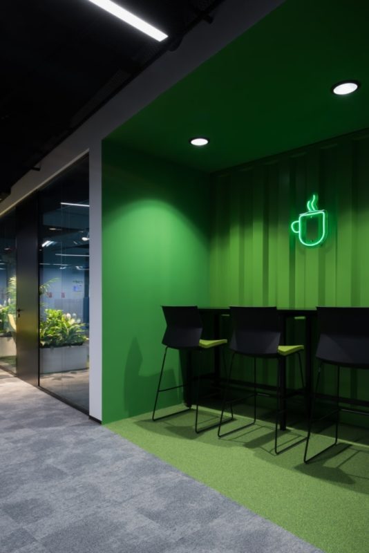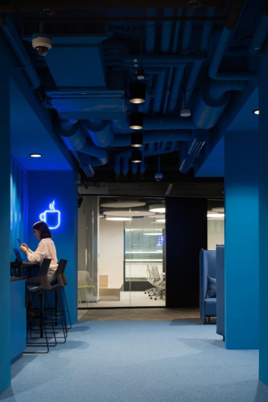 The source of inspiration became innovations in the office culture, where space design should not only be a decoration, but must support main office processes. Feeling the image of a city of the future with neon lights, bright colors and technologies (“Blade Runner” — author’s note) is the main feature of the office.