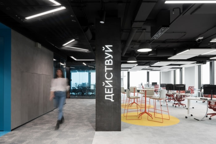 Color accents in the interior are a main part of not only the design, but also of navigation in space. Every color has its identity: coffee point, zone of informal interaction, wardrobe, shower room etc. Those large color spots make it easy to navigate in the office.