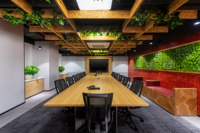 Executive Cabins are based on Grey-white theme. The Conference room is designed on a low light intensity with raw theme. The feature wall makes a statement with exposed red brick work superimposed with synthetic grass. The exposed ceiling paired with wooden framework having simple, straight architectural lines lend an understated sense of balance & peace to the room’s decor.