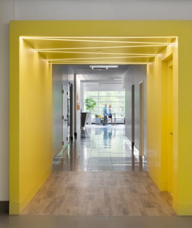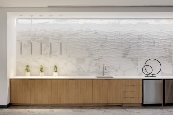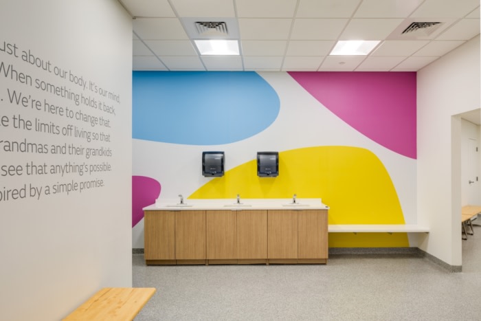 The redesigned space builds off the client’s mission of people-centric innovation. Redesigned Surgeon Education labs and operating rooms provide spaces where surgeons can learn the procedures and techniques required to provide life-changing surgical enhancements using groundbreaking medical technology. Strategically placed collaboration areas throughout the workplace allow staff to easily connect and ideate with one another. Integrated technology and progressive space planning support employee productivity, engagement, and wellness. The implementation of high impact colors and graphics within a serene and textural overall design showcases the global brand and aligns with new workplace standards.