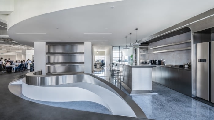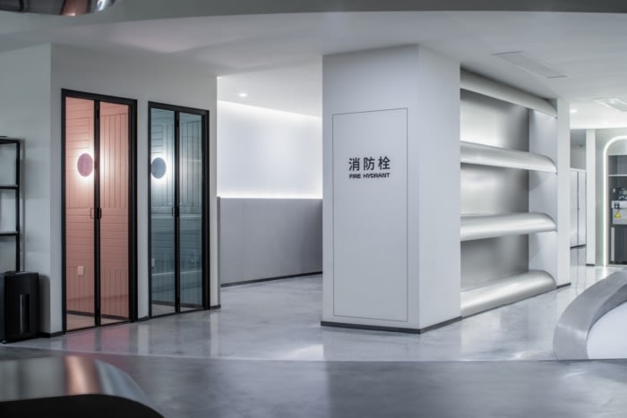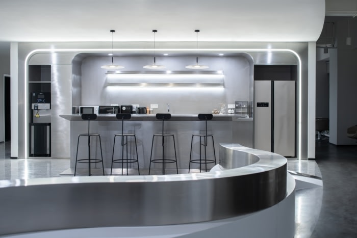 The objective of the renovation project is suspended between creating lightness and extrapolating the future. Corrugated glass is bent to create a series of curved screens resembling cascading ripples. Through the translucent glass screens, the reception area experiences changing light effects throughout the day, creating a sense of rejuvenation, an ever-going exploration in the beauty industry. The stainless steel-cladded lounge area is the central area for communication. Concept collides, diffuses and deposits, forming a “smart island”, which brings new vitality to the company.