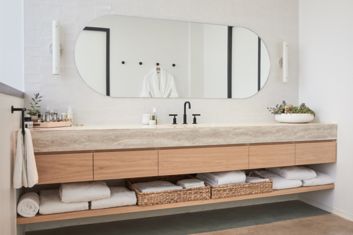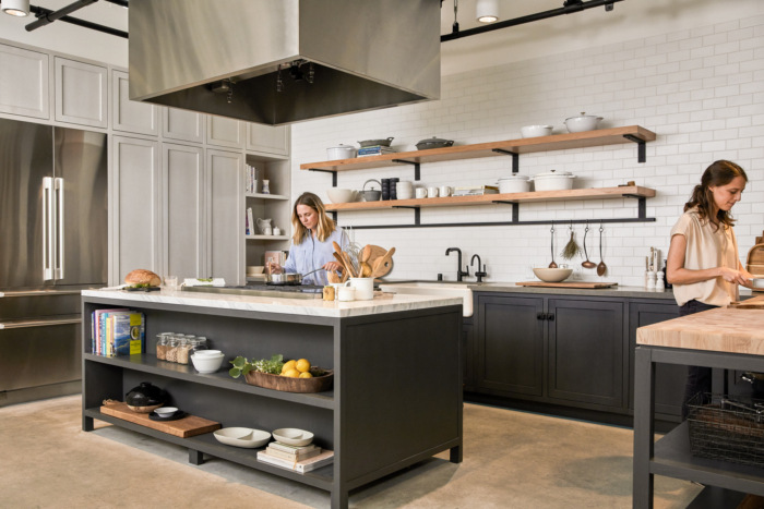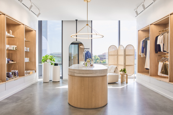Numerous spaces around the office are designed to cultivate expansive thinking and creative development. There’s a product room and lab for wellness innovation, a test kitchen to experiment with recipes and film the YouTube series hosted by Paltrow and other goop editors, and a fashion and design workroom for exploring styles and designing new collections for G. Label. To satisfy goop’s eager audience, new multi-platform content is captured in photo and video studios and a podcast recording studio. A high level of transparency within the space and between teams supports open communication and productive collaboration, ultimately creating a culture of empowered partnership.