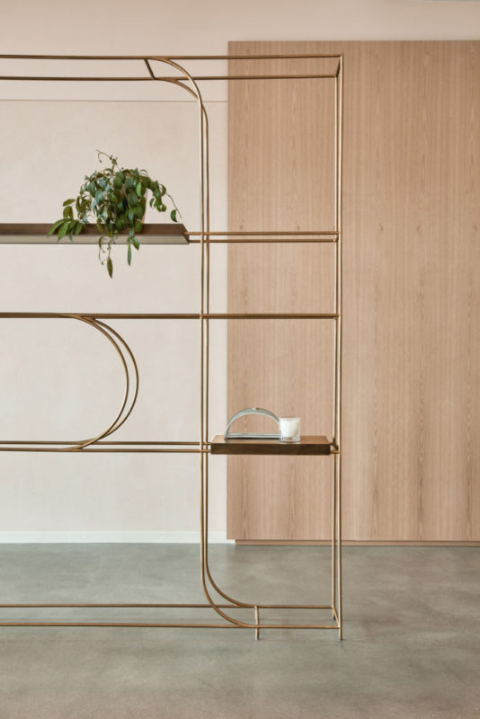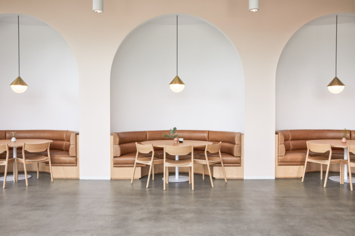 A custom reception desk by North Hollywood-based Artcrafters welcomes visitors to the space. Sleek and sculptural, it mimics the scooped forms in the company’s name. Adjacent, a wide, rounded metal screen fabricated by Bayly Art wraps around the room. Sweeping curves emerge again in larger architectural moments and are echoed in small furniture details – gestures that guide people through the office and create an intrinsic flow. The color palette – soft, warm, and inviting – is equally pleasing to the senses.
