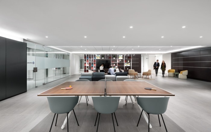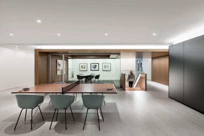 The heart of the cross-shaped floorplate forms a central employee “hub” uniting the 3 intersecting practice wings as a crossroads of employee activity. The space is designed to feel like a casual open-plan living space, with informal meeting and lounge areas, a library, coffee bar, and even a ping-pong table!
