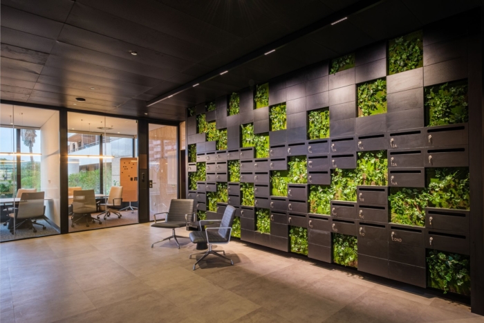 The main idea was to transform the entrance floor into something more than a “simple” reception. The aim was to make this large area of about 1,000 sq.m more dynamic by introducing various features and new environments. Besides a new reception desk, there are sitting and relaxing areas and a range of shared services, within the WorkCafé concept, such as auditoriums, meeting rooms and collaborative workspaces. In the lift halls of the remaining floors, a modern environment has been assigned with a floor signage. Neutral materials were chosen, in shades of black and beige, which meet the chromatic patterns of the base of the building – the marble stone. The inclusion of natural elements, such as wood, green walls and plants increase the feeling of comfort and the quality of the environment. In order to provide a unique and distinct character to the building, it was proposed the installation of a significant scale author piece by the meeting area.