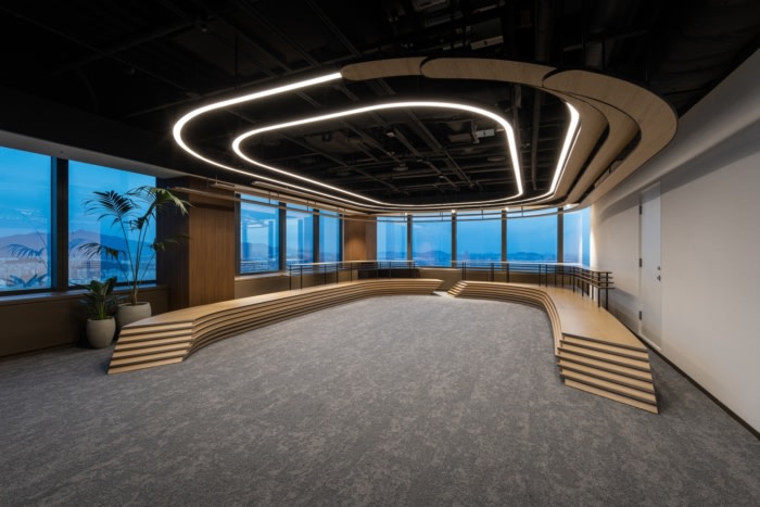 The workspace is capable of adapting to various forms of workflow with the application of the smart office system. There are various meeting rooms, open collaboration, focus areas, and town hall spaces that meet the needs of different teams. The cafeteria is reminiscent of a café surrounded by greenery and gardens to give some reprieve from work stress. Keeping up with the modernization of financial services and technology innovation is what drives our client to keep innovating and improving.